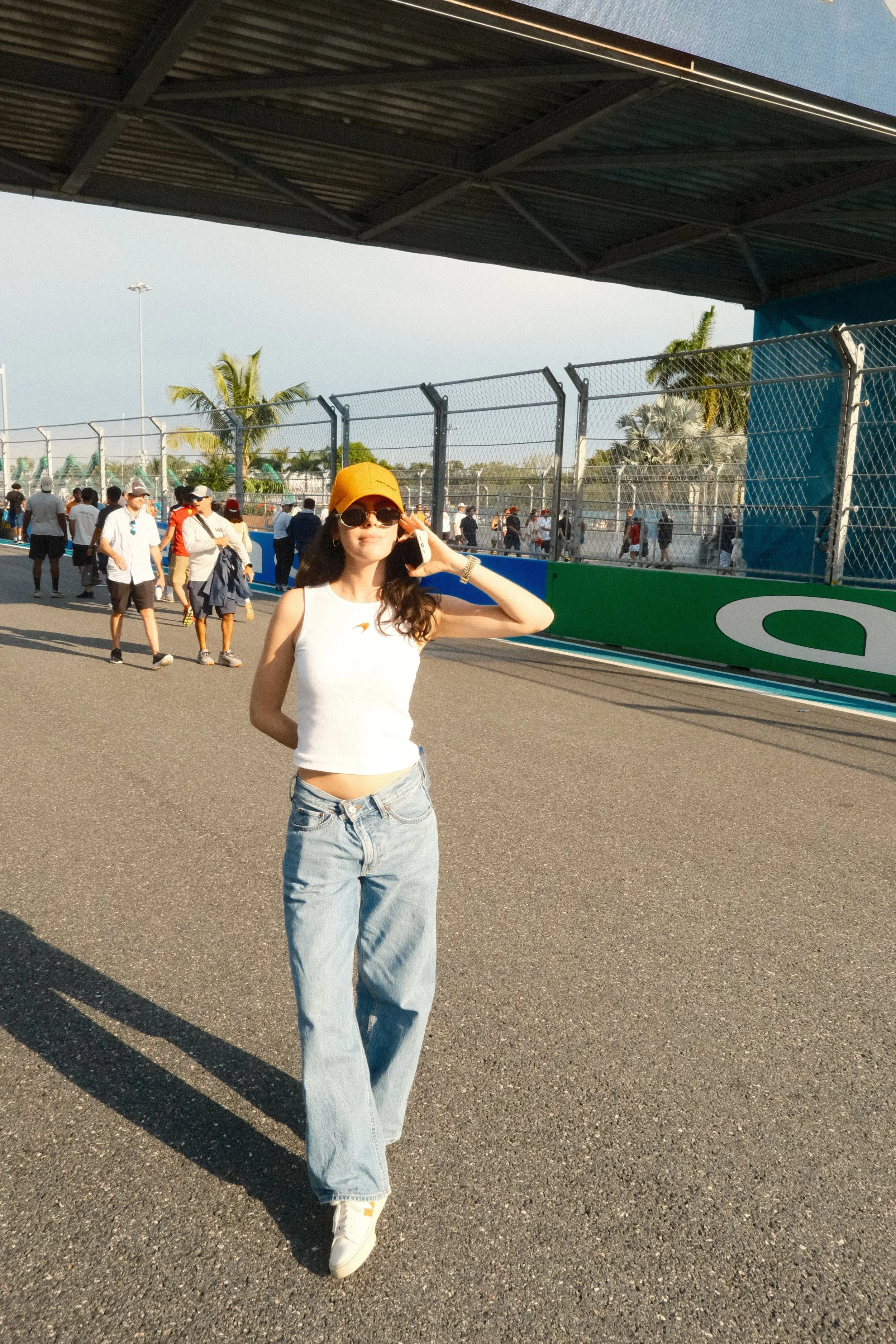 Wear shoes you’re comfortable walking in and wouldn’t be heartbroken if they get a bit dirty. You’ll be walking on all sorts of terrain across the campus, and if you spend time along the fence feeling the sheer speed of the cars fly by, note that dust does go flying as the laps pass. A good city sneaker can go a long way, with Vejas, Adidas Sambas or Spezials, or Golden Goose shoes all being popular choices in Miami right now.